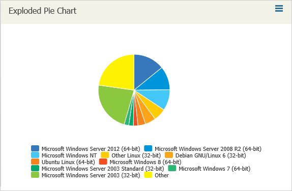 Exploded pie charts allow you to show the size of values proportional to the sum of all values. Series fields in exploded pie charts are shown as unique values presented in the chart legend. Data fields are shown as slices that represent aggregate values (that is, a percentage of the whole pie). Category fields are not used for pie charts.
