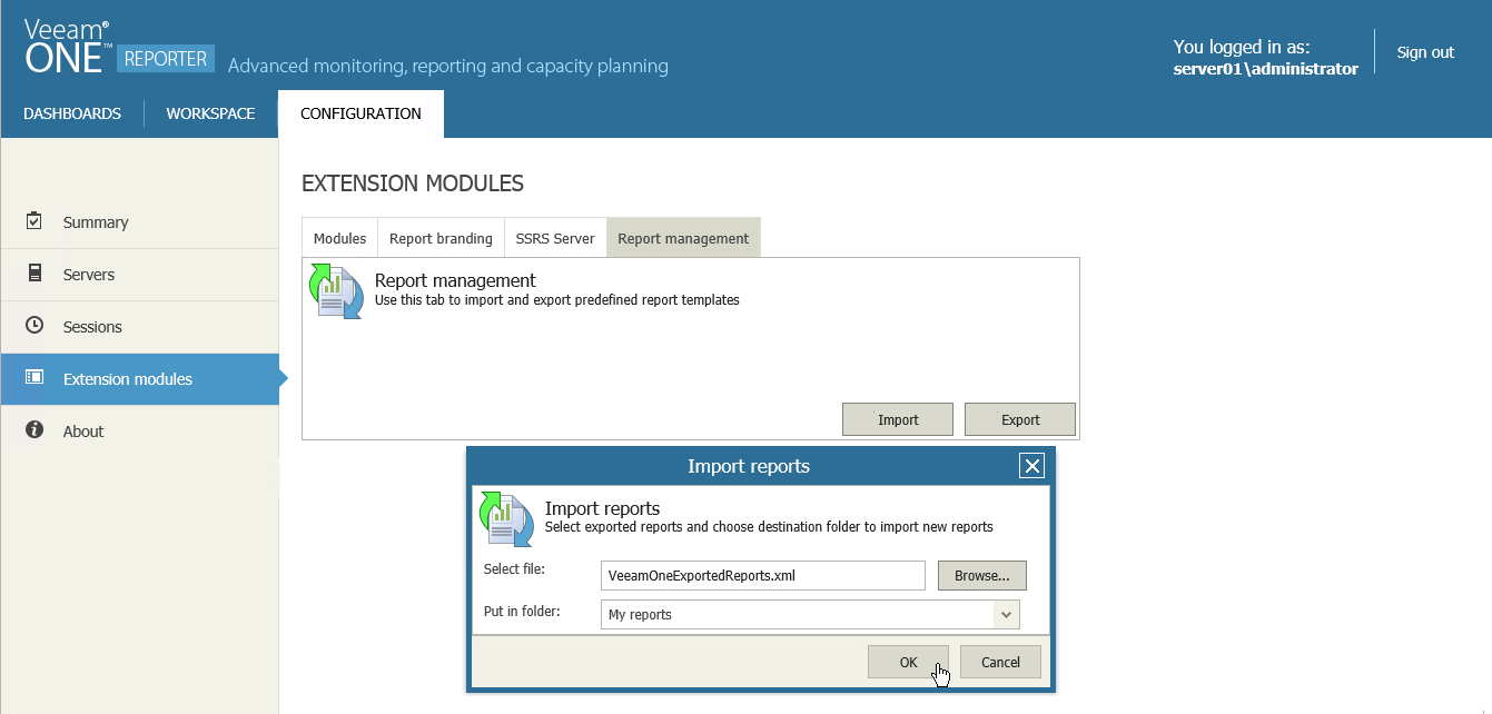 You can export saved user report templates to an .XML file and import report templates from an .XML file. Exporting and importing can be useful if you need to back up custom-designed report templates, or if you want to copy report templates from one Veeam ONE deployment to another.