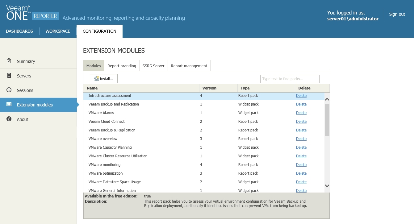 Extension modules are add-on elements that can be deployed to enhance the Veeam ONE Reporter functionality. The following types of extension modules are available: