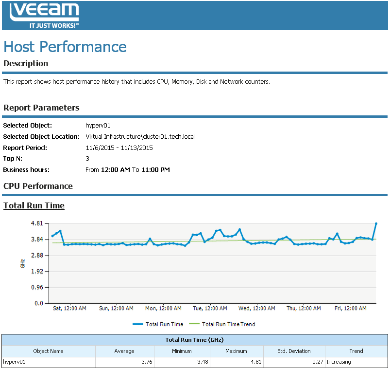 This report aggregates historical data and shows performance statistics for a selected host across a time range.