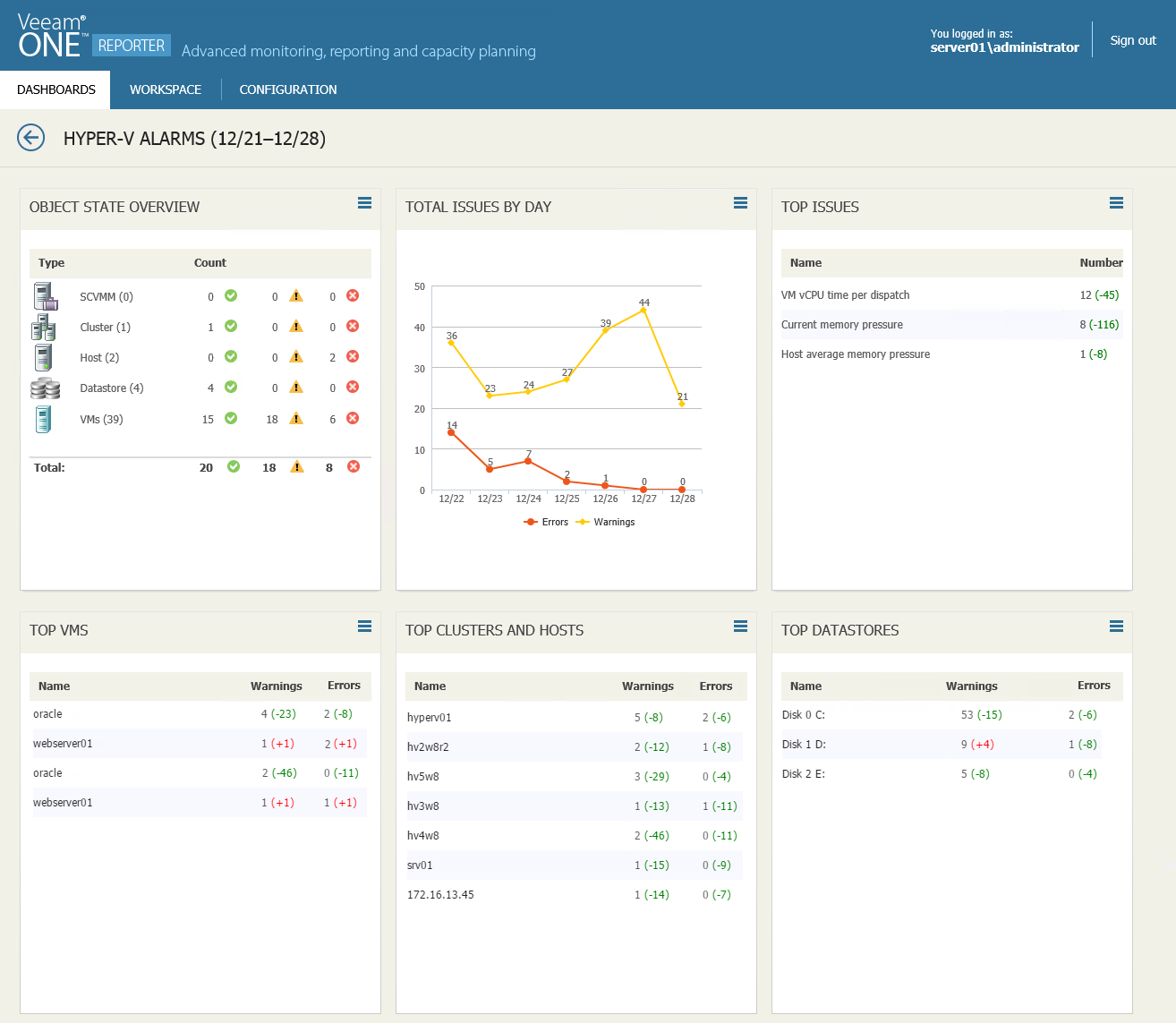 The Hyper-V Alarms dashboard provides an overview of alarms triggered by Veeam ONE Monitor during the past week. The dashboard allows you to identify the most typical issues that occur in your environment and to simplify troubleshooting.