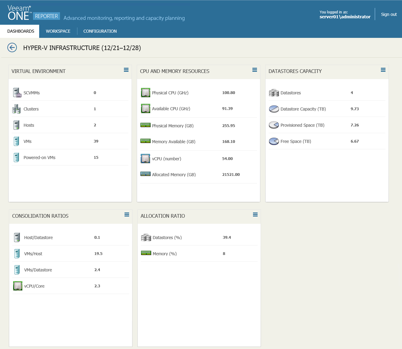 This widget assesses physical compute resources deployed across Hyper-V hosts and shows the amount of available resources allocated to VMs.