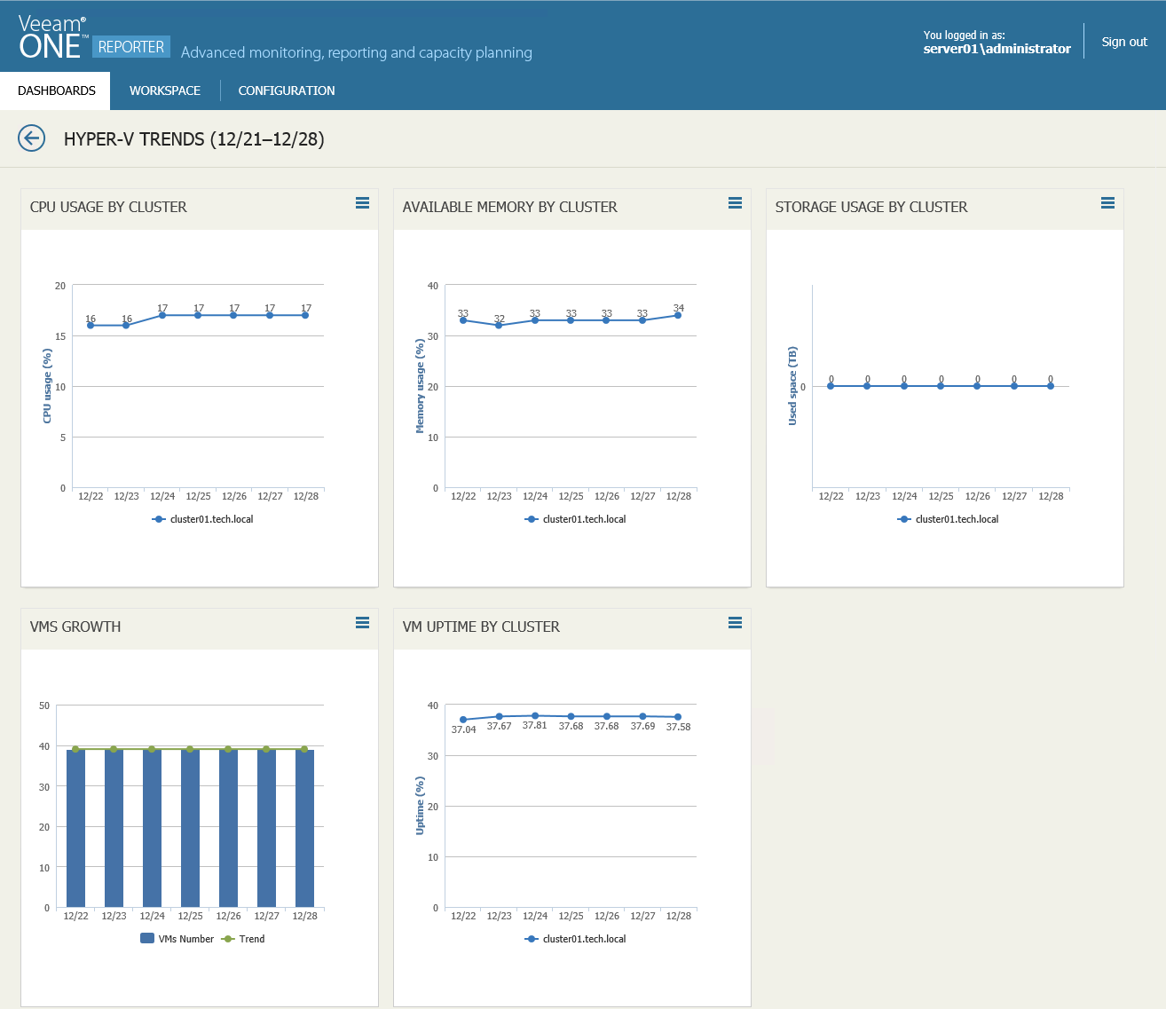 The Hyper-V Trends dashboard helps you track resource utilization in your Hyper-V infrastructure by displaying growth trends for the previous week.