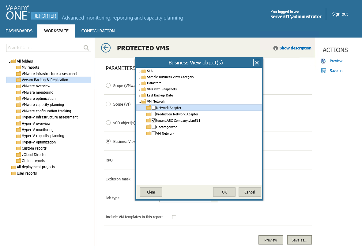 The following example shows how you can create the Protected VMs report for specific business view groups: