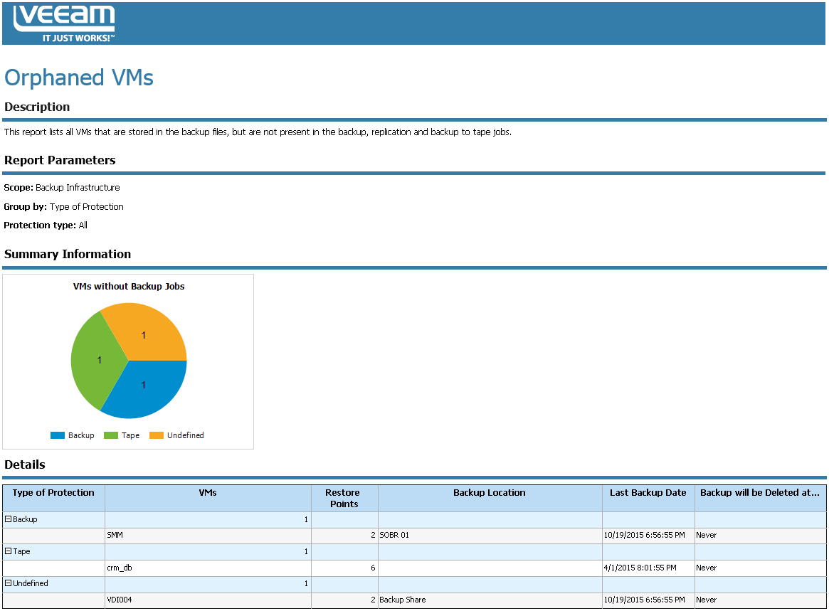 The report enumerates all found VMs and provides details on the type of VM protection, the number of restore points accommodating the VM, the backup location and the date of the most recent backup session. Additionally, it states when the backup will be deleted according to the current file retention policy.