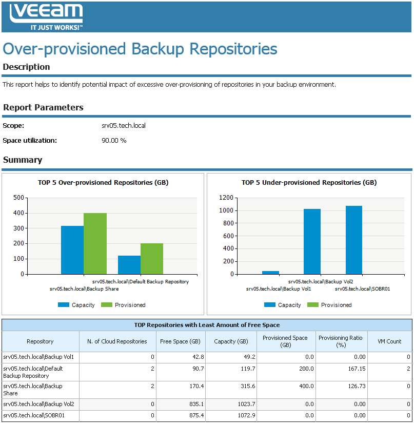 When configuring cloud repositories, cloud administrators can allocate more storage space than there is available on the underlying backup repository. This report helps you assess the potential impact of excessive over-provisioning for cloud repositories.