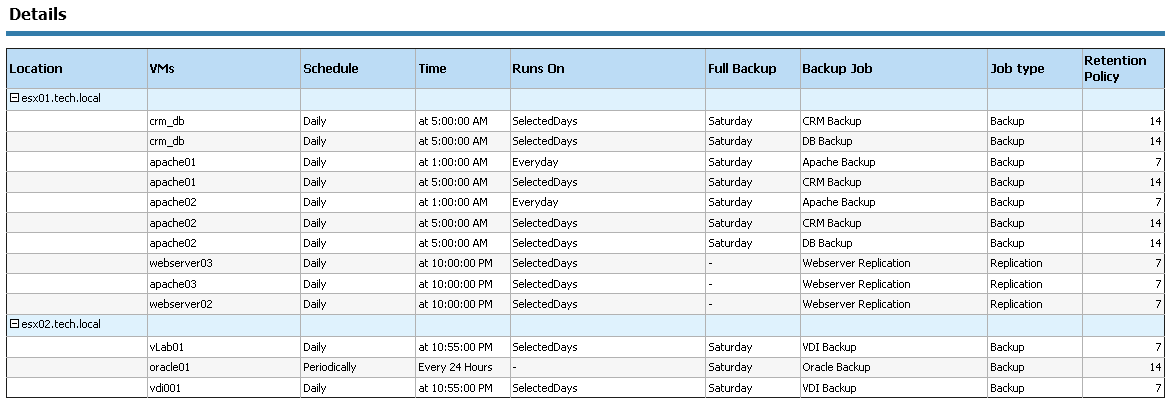 - The details table shows VMs included in the jobs, scheduled run time and date, recurrence intervals, weekly full backup schedule for backup jobs and the effective backup file retention policy.