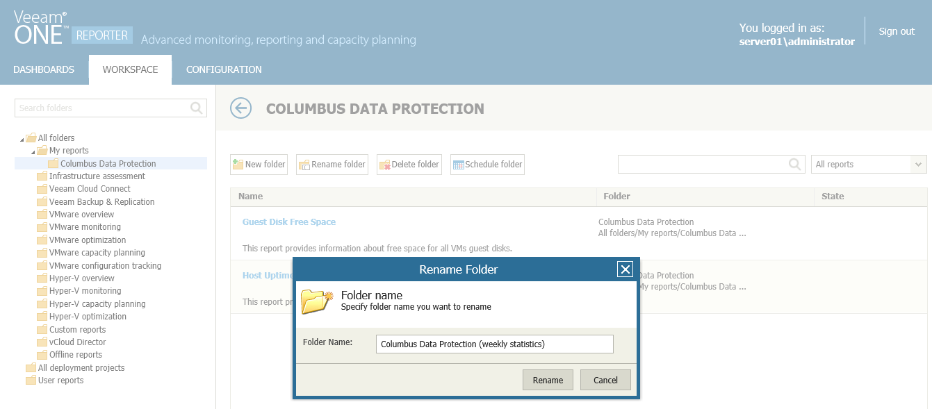 - Click Rename folder at the top of the report list.