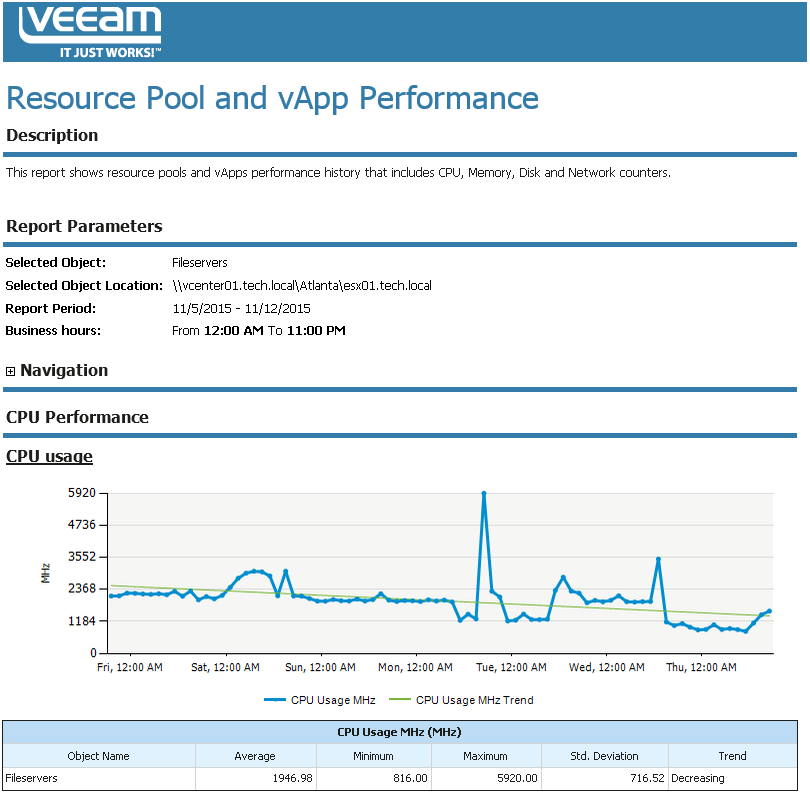 This report aggregates historical data and shows performance statistics for a selected resource pool/vApp across a time range.