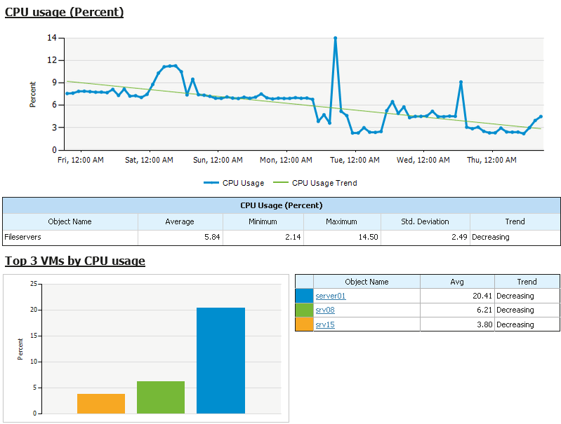 The report shows tables and performance charts with statistics on CPU, memory, disk and network usage for the resource pool/vApp. The report also lists top resource consuming VMs and calculates resource usage trends for them.