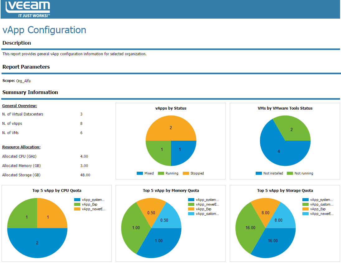 The report provides Top 5 charts that display vApps with the highest level of CPU, memory and storage utilization. The report also includes a chart that shows the number of powered off, powered on, resolved and suspended vApps, and a chart that shows statuses of VMware Tools installed in VMs that belong to the organization.