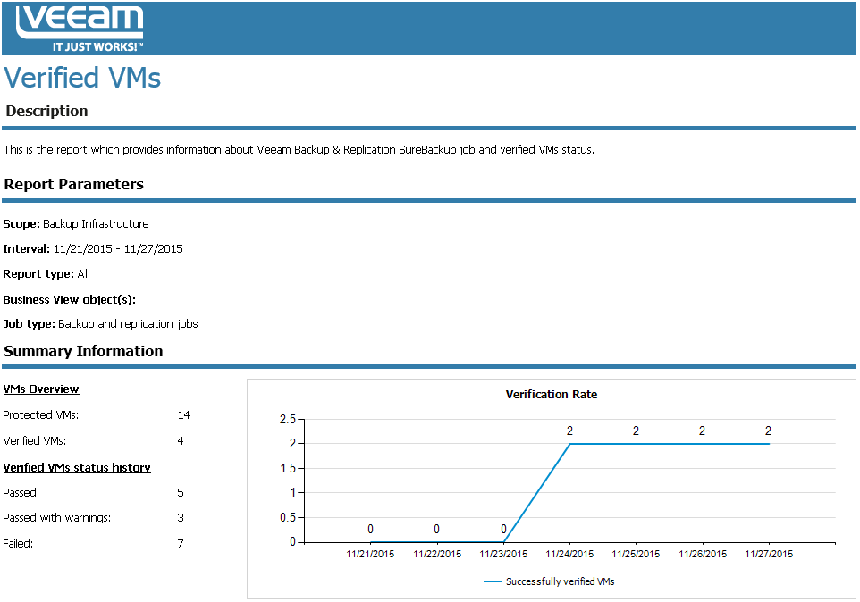 This report provides information on SureBackup jobs performed by Veeam Backup & Replication and displays the summary of verified VMs.