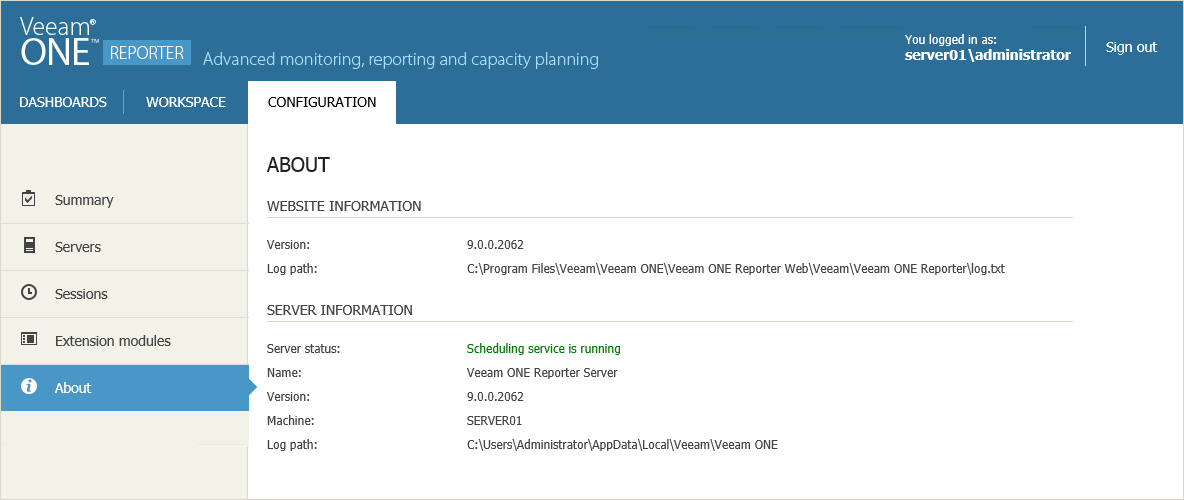 - Website information section displays the current version of the product and the location of the log files for the Veeam ONE Reporter Web UI.