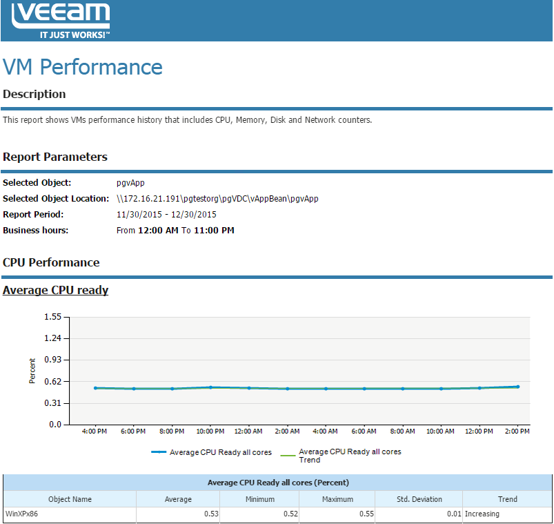 This report aggregates historical data and shows performance statistics for a selected VM across a time range.