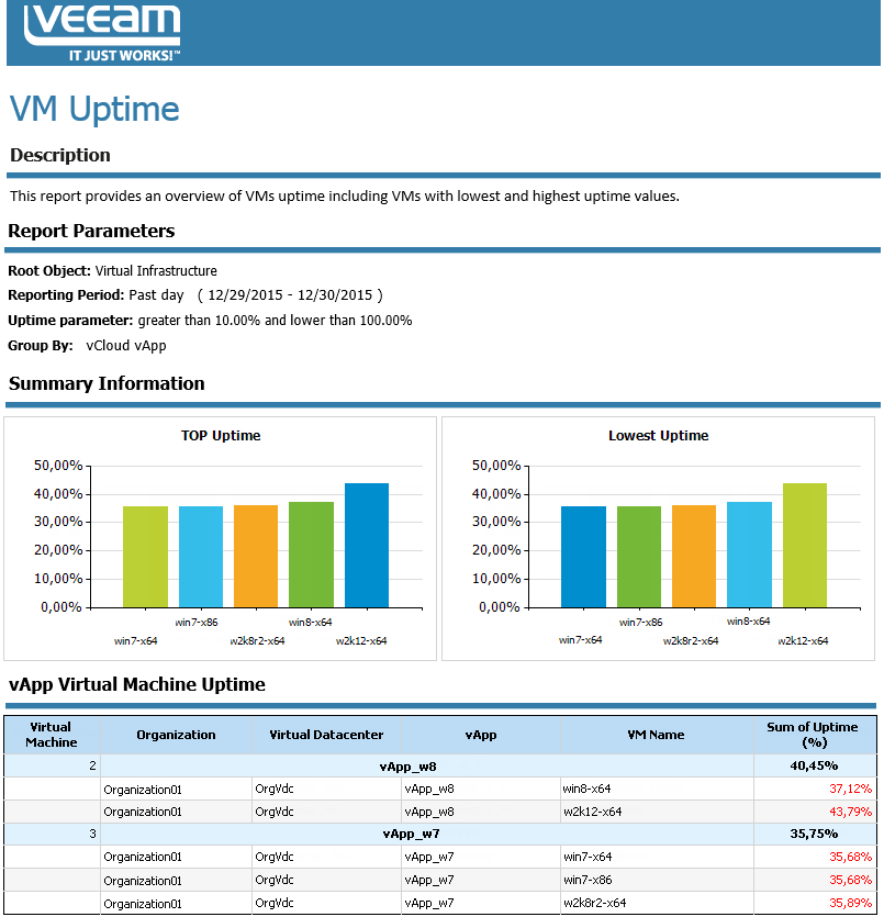 Uptime is a measure of time a VM has been up and actively running on a host. When a VM is not operating, cloud space allocated to it is not being used productively. Use this report to track uptime of virtualized workloads.