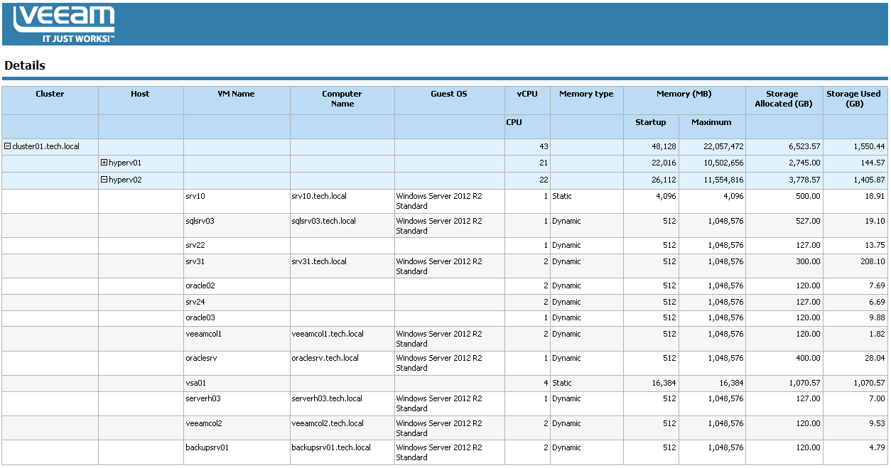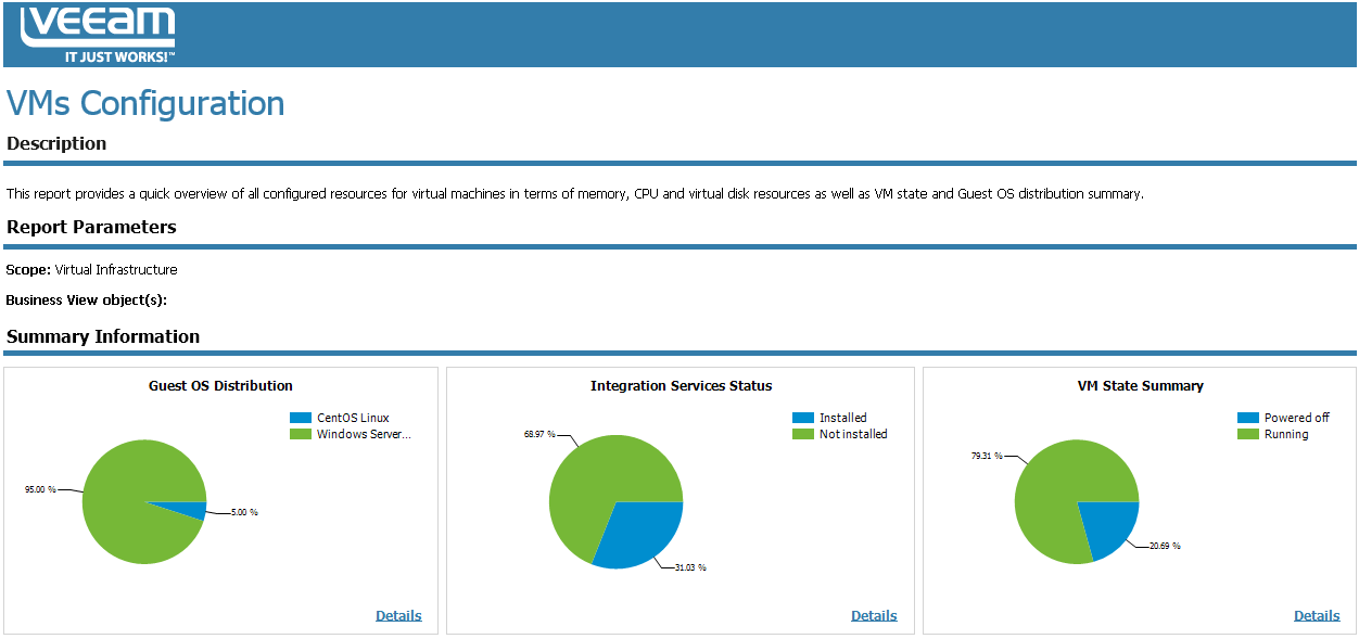 The report provides information on memory, vCPU and storage allocation, power state, and guest disk usage for each VM included in the report scope. The report also shows charts that display percentage distribution of VM power states, Integration Services statuses and guest OS kinds installed on your VMs.