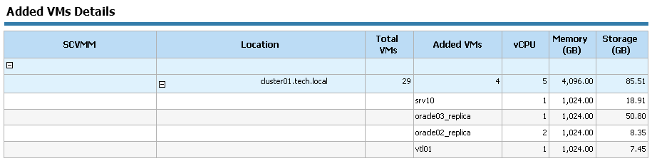 For each added/removed VM, the report provides information on the location of the VM and its configuration properties.