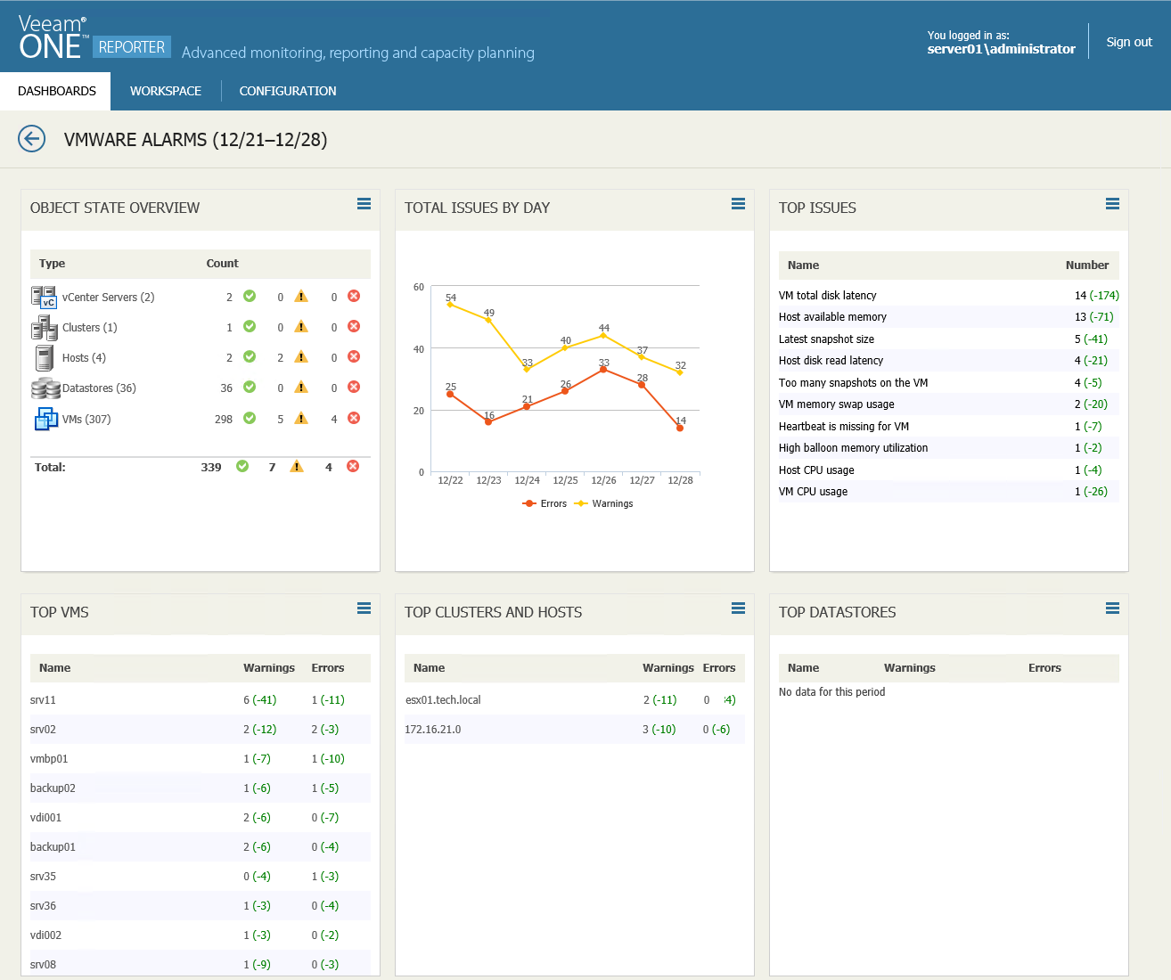 The VMware Alarms dashboard provides an overview of alarms triggered by Veeam ONE Monitor during the past week. The dashboard allows you to identify the most typical issues that occur in your environment and to simplify troubleshooting.