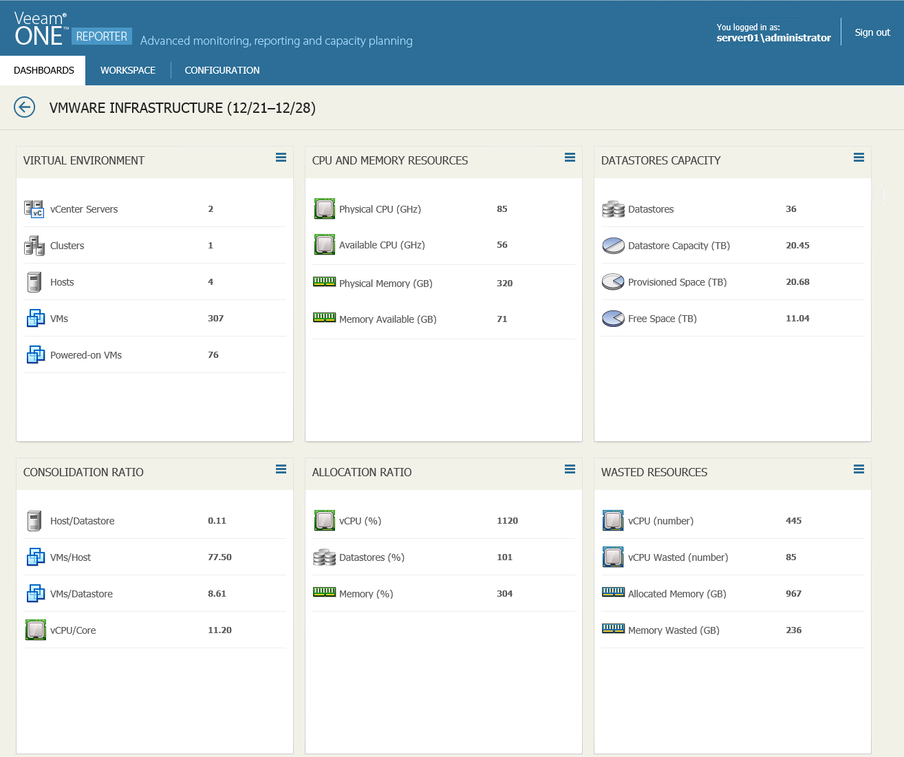 This widget assesses physical CPU and memory resources installed on ESX(i) hosts and shows the amount of available resources allocated to VMs.