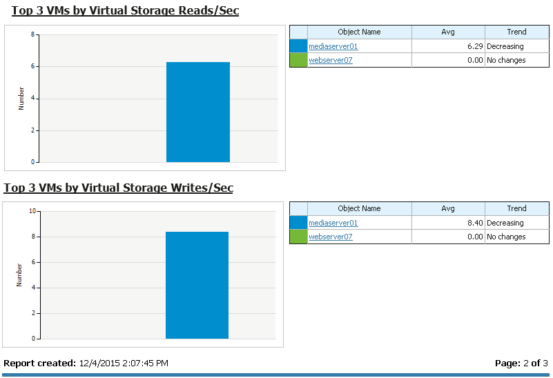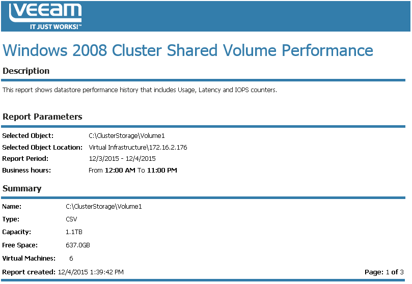 The report shows tables and performance charts with statistics on read/write rates and IOPS for the CSV. The report also lists top 3 resource consuming VMs and calculates resource usage trends for them.
