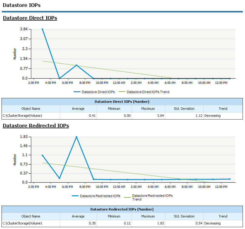 This report aggregates historical data and shows performance statistics for a selected Windows Server 2008 Cluster Shared Volume across a time range.
