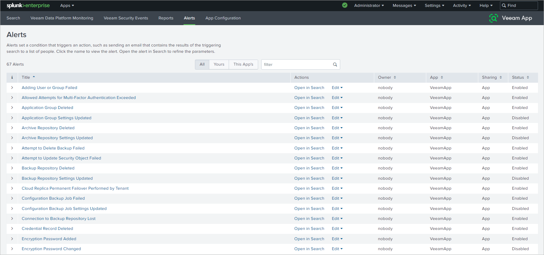 Veeam App for Splunk provides you with built-in alerts triggered when Splunk search results meet alert conditions. Alert conditions are based on Veeam security and monitoring events and checked periodically at specific time intervals. By default, all alerts are disabled and expired in 24 hours if enabled.