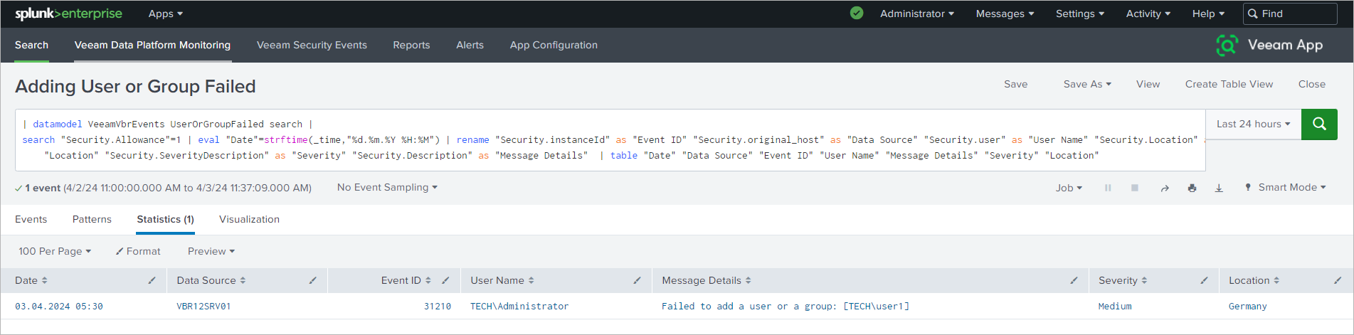 Four-Eyes Authorization Disabled | At least one Veeam event with ID 42401 (Four-Eyes Authorization Disabled) is found. | Critical | Every 5 minutes |
