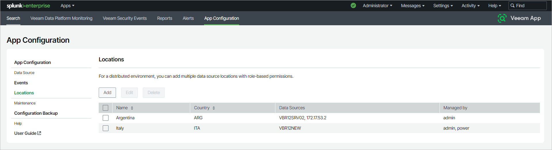 Veeam App for Splunk does not affect data access permissions configured at the Splunk level. Managing locations allows you only to filter data displayed on Veeam dashboards, reports, and alerts. To manage data access permissions, follow recommendations from Splunk documentation: