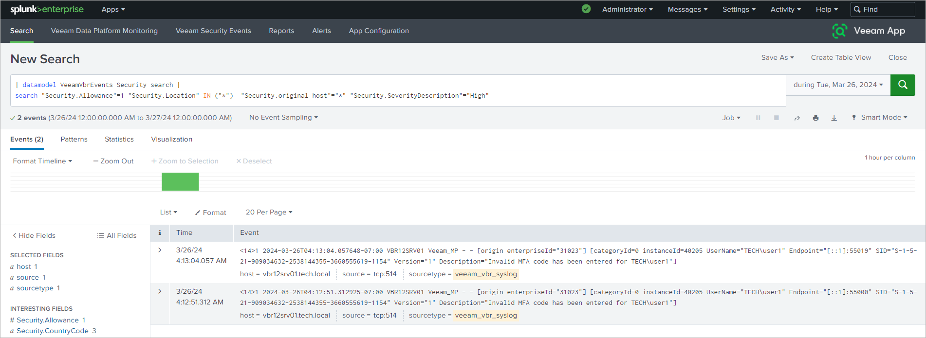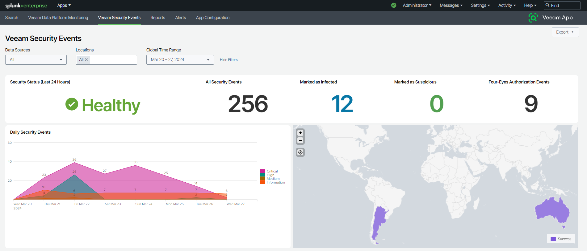The Veeam Security Events dashboard displays infrastructure security state and aggregated information about security events triggered on your Veeam Backup & Replication servers.