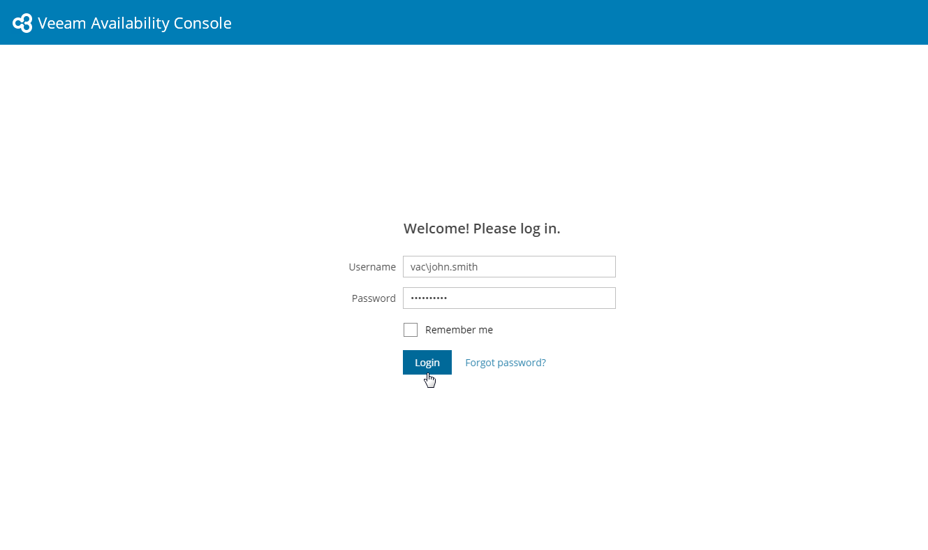 If you log in for the first time, you can use credentials of the local Administrator account on the machine where Veeam Availability Console is installed. For future work, you can create other users in Veeam Availability Console. For details, see Managing Portal Users.