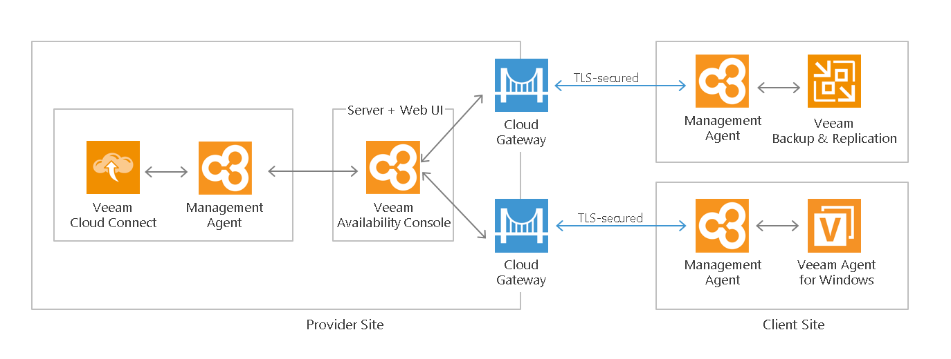 Veeam Availability Console allows you to manage Veeam backup agents and Veeam Backup & Replication installed on machines in local or remote networks. To communicate with managed machines, Veeam Availability Console utilizes a cloud infrastructure implemented with Veeam Cloud Connect.