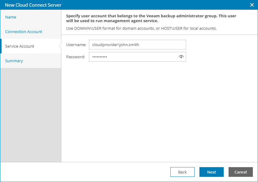 1. At the Service Account step of the wizard, specify credentials of a user account with Veeam Backup Administrator privileges in Veeam Backup & Replication on the Veeam Cloud Connect server.