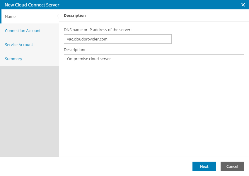 Veeam Availability Console will launch the New Cloud Connect Server wizard.