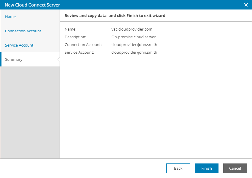 This account will be used to install a Veeam Availability Console management agent on the Veeam Cloud Connect server.