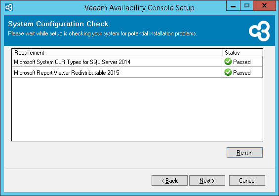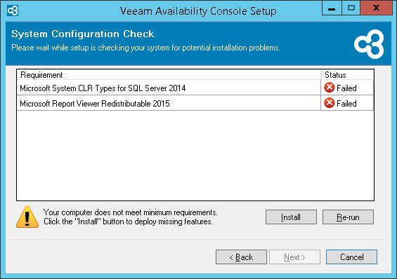 Before proceeding with the installation, the installer will perform system configuration check to determine if all prerequisite software is available on the machine. To learn what software is required for Veeam Availability Console, see System Requirements.