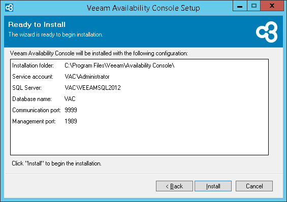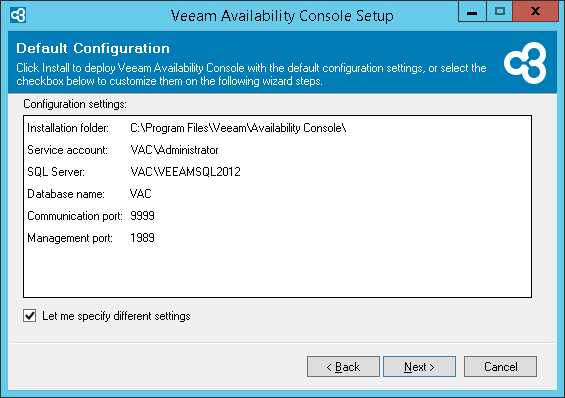 If you choose to install the Veeam Availability Console Server component with the default configuration settings, the setup wizard will use the following configuration for installation: