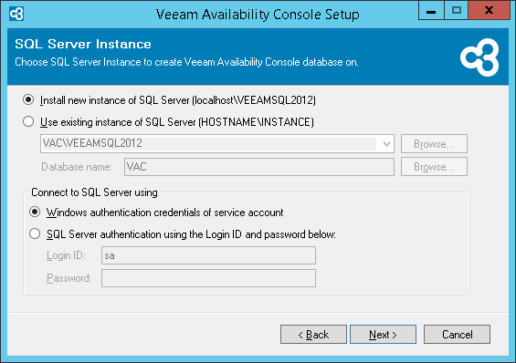 - Microsoft SQL Server: LOCALHOST\VEEAMSQL2012. During installation, the setup wizard installs a new instance of Microsoft SQL Server locally on the Veeam Availability Console machine.