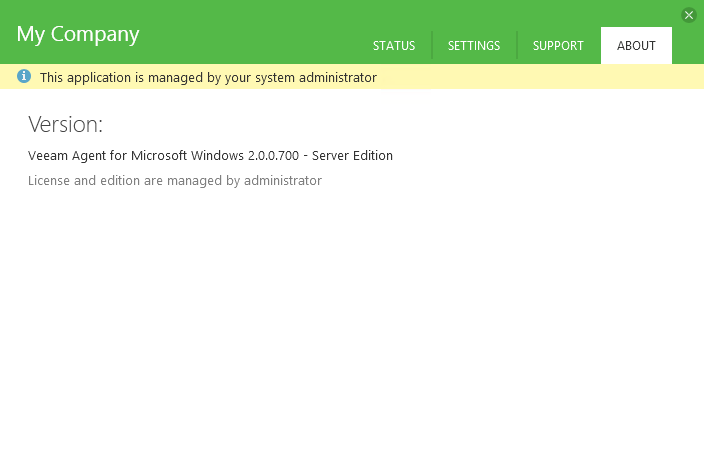 In the managed mode, Veeam backup agent Control Panel displays the name of a managing company at the top left corner. The About section in the Control Panel displays a notification saying that the license and edition are managed by the system administrator.