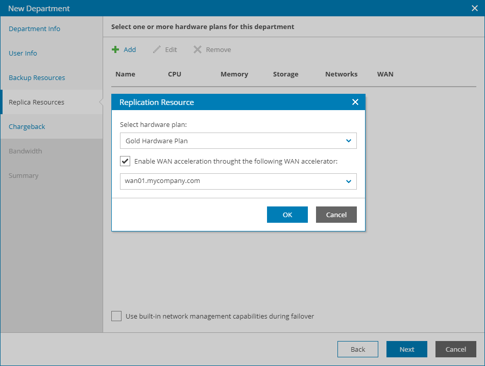 - If the department plans to use WAN accelerators for replication jobs, select the Enable WAN acceleration through the following WAN accelerator check box and choose a target WAN accelerator configured on the service provider side.