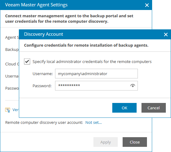 - In the Veeam Master Agent Settings window, click the Remote computer discovery user account link.