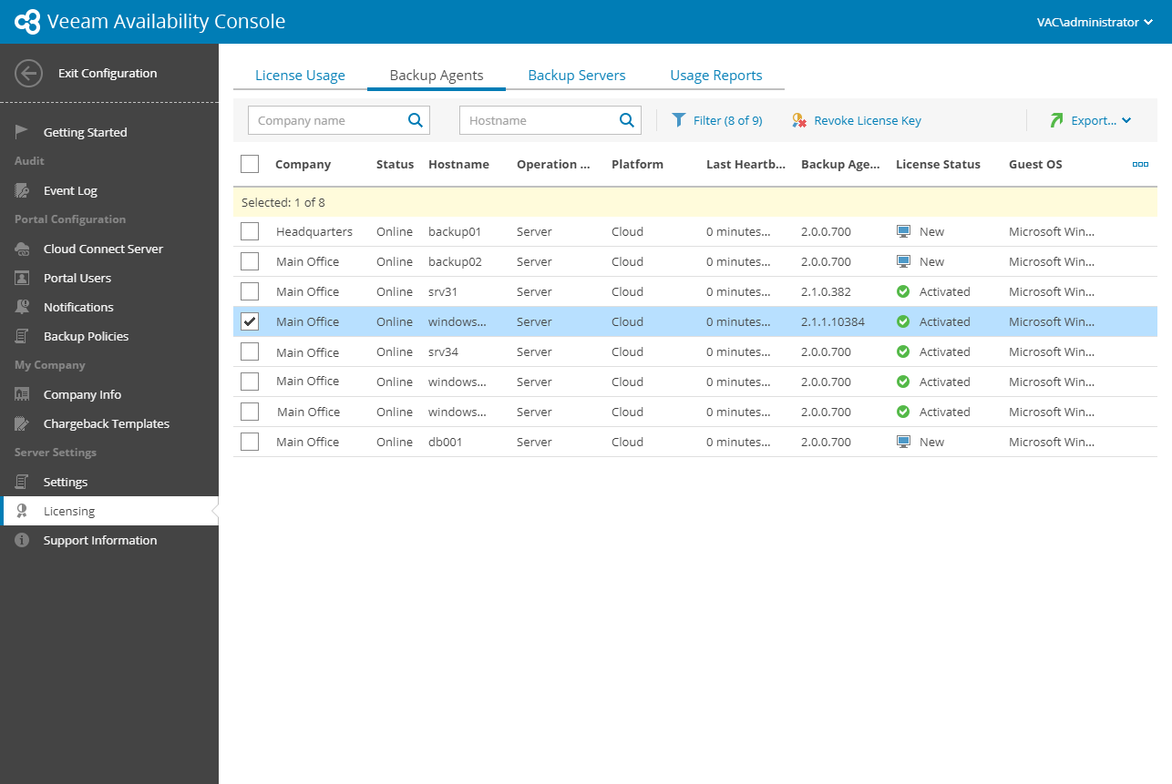 The Backup Agents view provides a list of Veeam backup agents managed in Veeam Availability Console, and information about their license status.