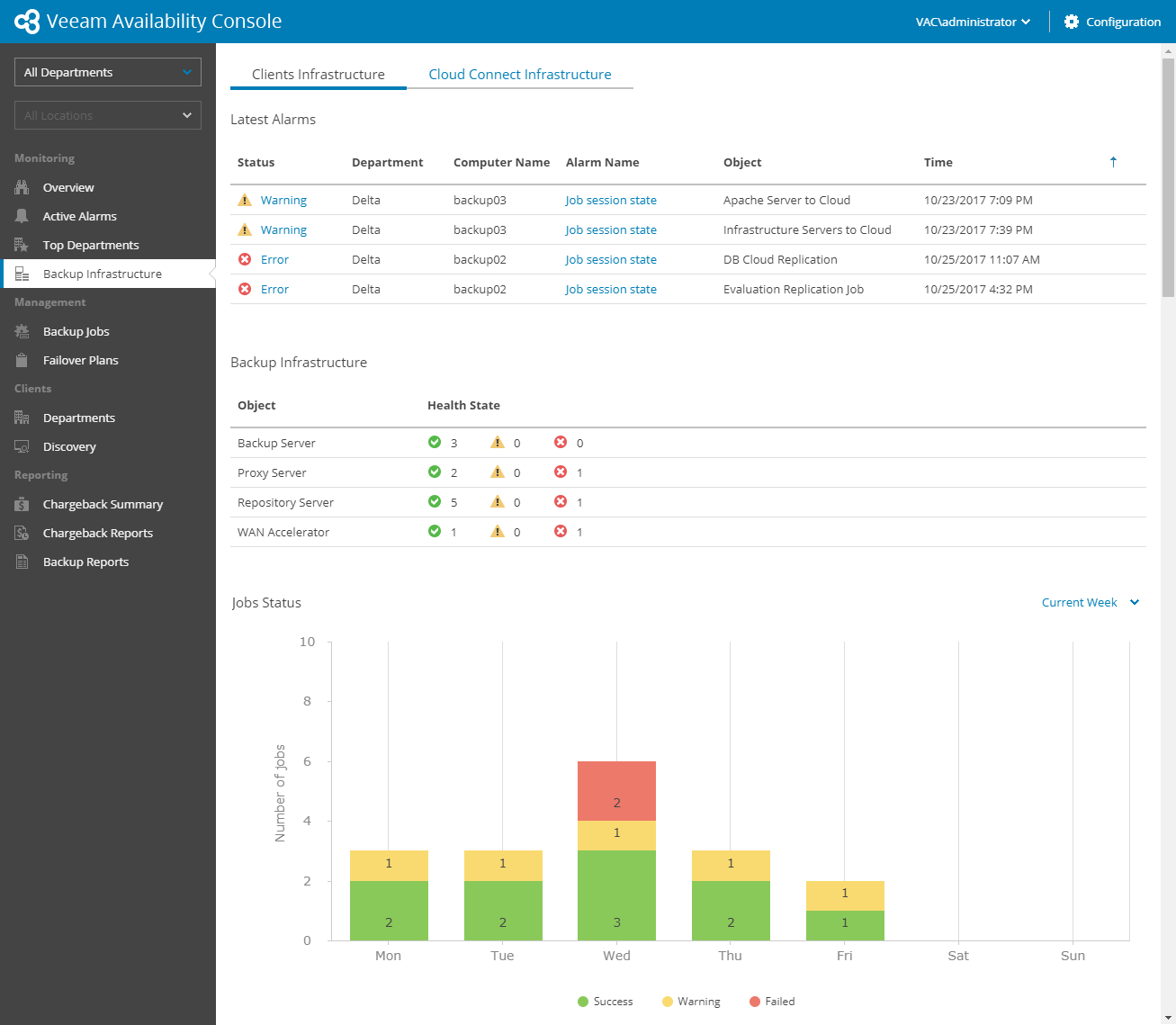 - To show data for a specific department and/or location, use department and location filters at the top left corner of the Veeam Availability Console window.