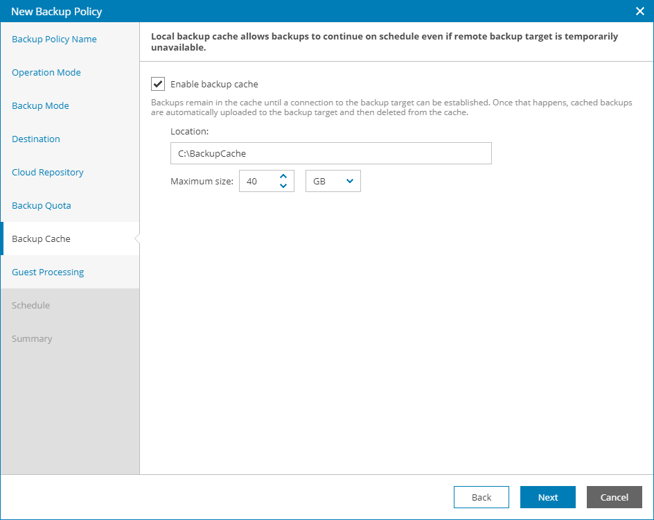 The Backup Cache step of the wizard is available if you have chosen to save backup files on a remote storage: in a network shared folder, on a Veeam Backup & Replication repository or cloud repository.