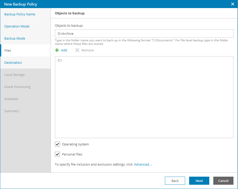 The Files step of the wizard is available if at the Backup Mode step you have chosen to create a file-level backup.