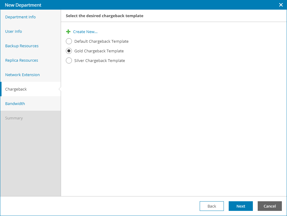At the Chargeback step of the wizard, select a chargeback template that must be assigned to a department.