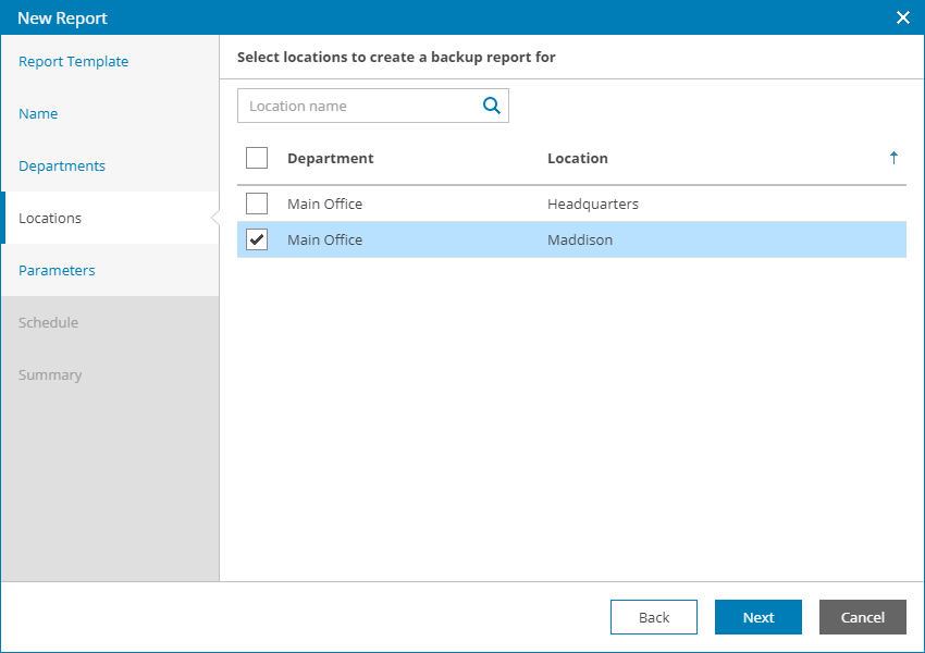 - At the Locations step of the wizard, select one or more department locations. Use the search field at the top to find the necessary location.