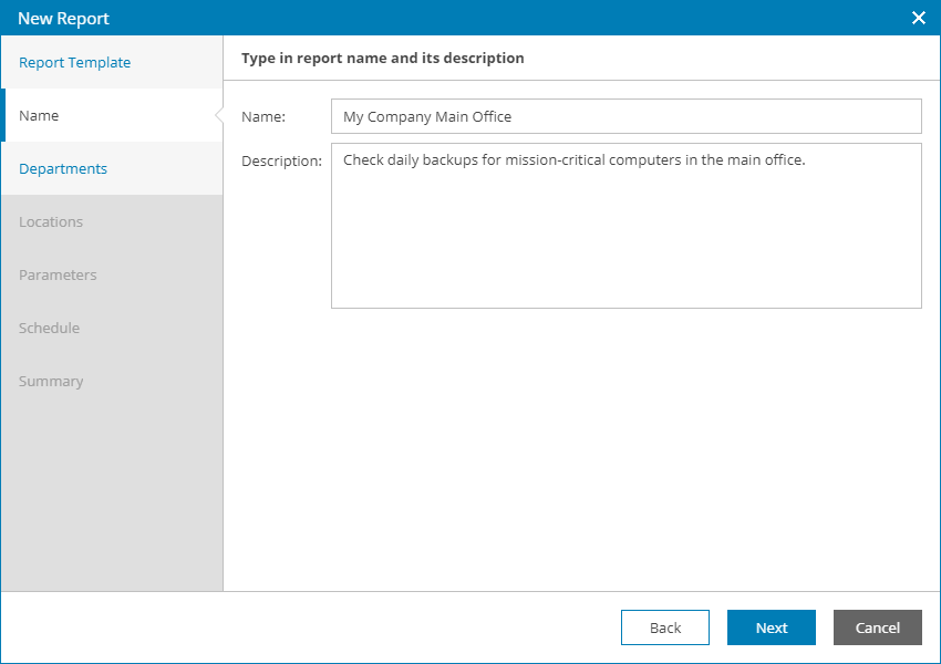 Before you run a backup report, you must create and save a report configuration. A report configuration stores custom report settings, such as the scope of the report, scheduling settings and so on. You can create multiple report configurations with different report settings for different departments and locations.