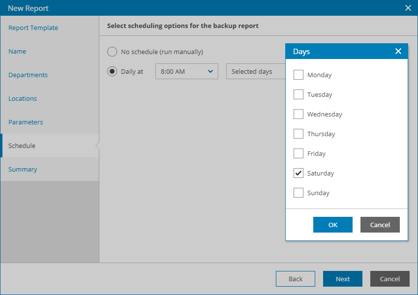 - At the Schedule step of the wizard, specify a schedule according to which the report must be generated and sent to departments: