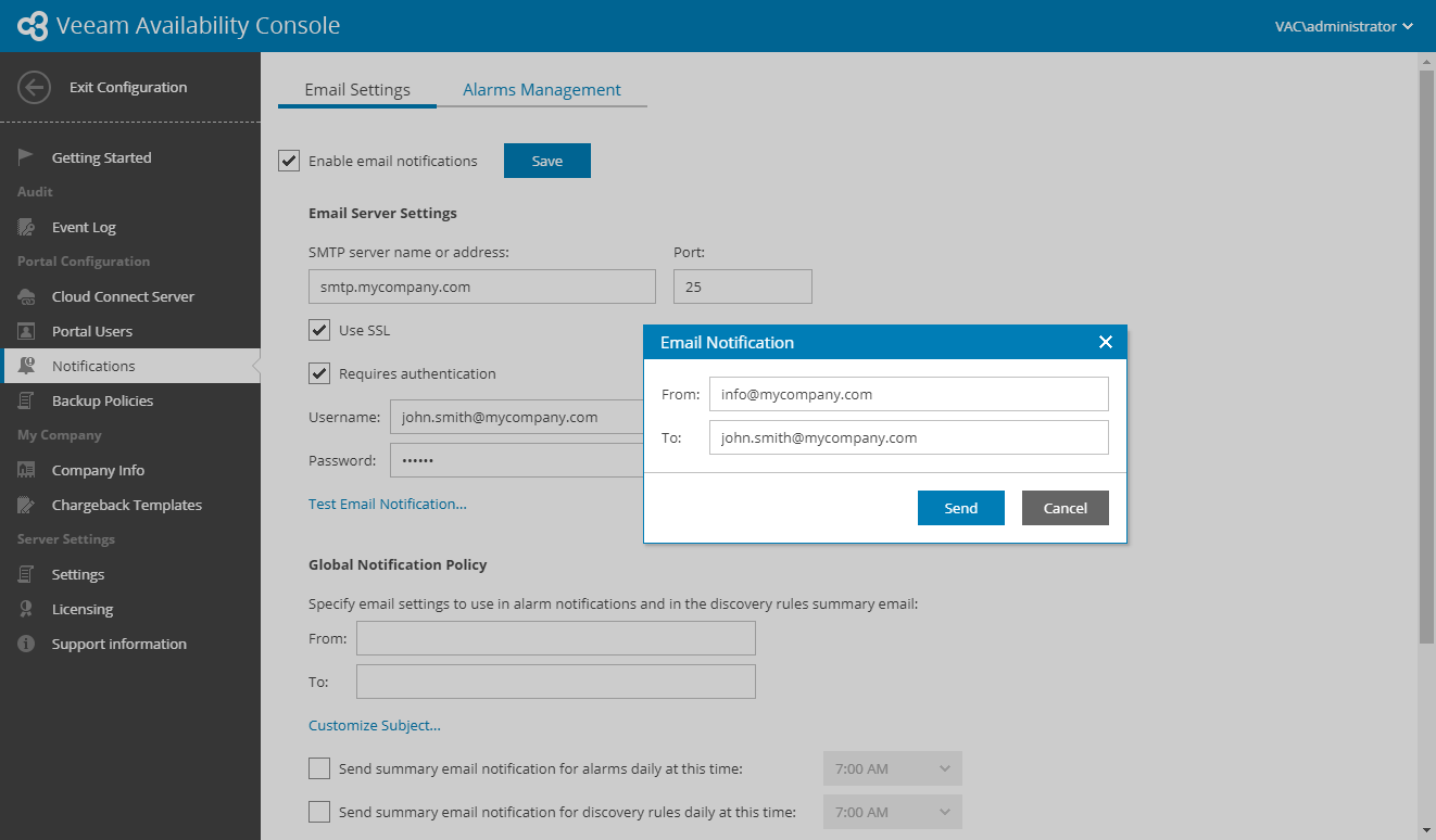 To send out and receive Veeam Availability Console notifications by email, you must configure notification settings: