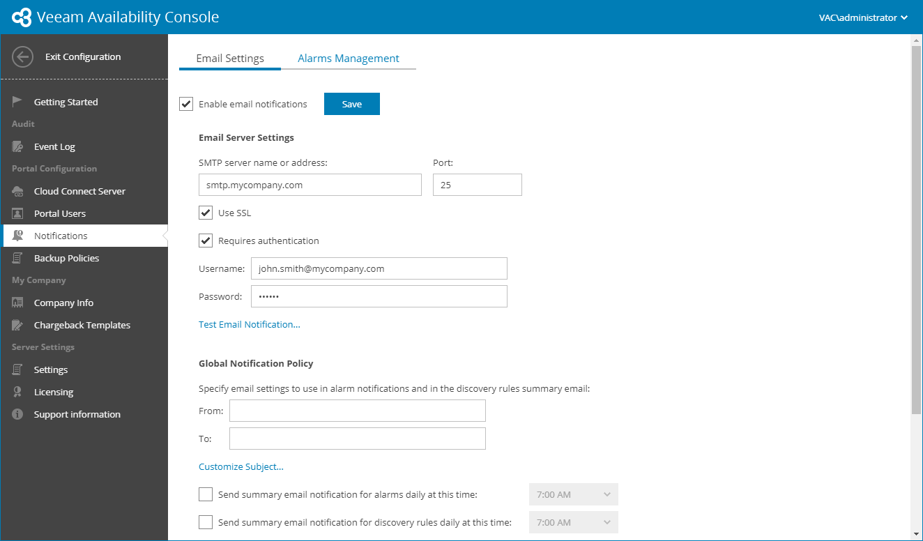 By default, Veeam Availability Console sends an alarm notification for each triggered alarm. Instead of receiving an email notification for every single alarm, you can receive a summary daily email notification with information about all alarms triggered for the past 24 hours.